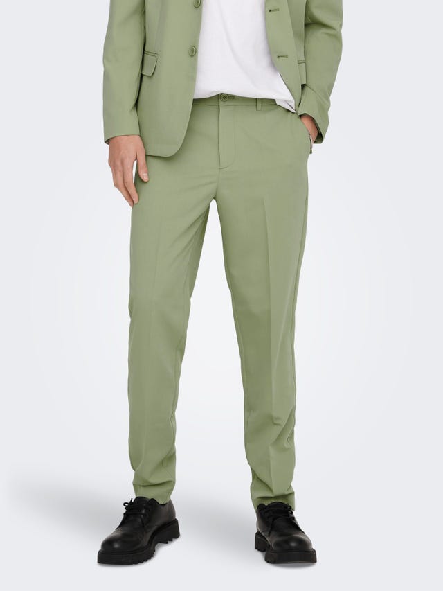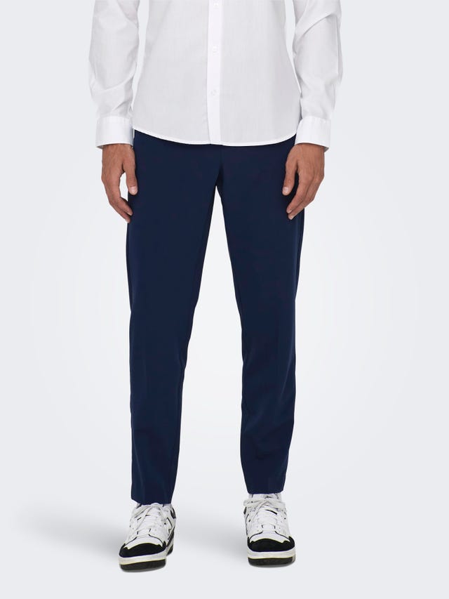 Wir klären dich auf: Was sind eigentlich Slim Fit Hosen? Slim Fit Hosen sind so konzipiert, dass sie den natürlichen Linien deiner Beine folgen, ohne dabei zu eng anzuliegen. Sie laufen vom Oberschenkel bis zum Knöchel leicht zu und kreieren so eine Silhouette, die wie maßgeschneidert wirkt, aber dennoch entspannt ist. Mit ihnen erzielst du einen glatteren Look als mit einer regulären Passform, hast aber mehr Bewegungsfreiheit als mit einem Skinny-Fit. Also schlichtweg der perfekte, moderne Fit für den modernen Mann. Bei ONLY & SONS sind unsere Slim Fit Designs unkompliziert, aber raffiniert. Denk an bequemem Bewegungsraum, klare Formen und hochwertige Stoffe, die du über den ganzen Tag trägst. Es geht nicht nur darum, Aufsehen zu erregen, sondern sich rundum wohlzufühlen. Unsere Auswahl reicht von weichen Baumwollmischungen bis hin zu Stretch-Materialien und bietet dir eine Welt voller Möglichkeiten, egal ob du eine Capsule-Garderobe zusammenstellst oder einfach nur nach diesem einen Paar suchst, auf das du dich verlassen kannst.
