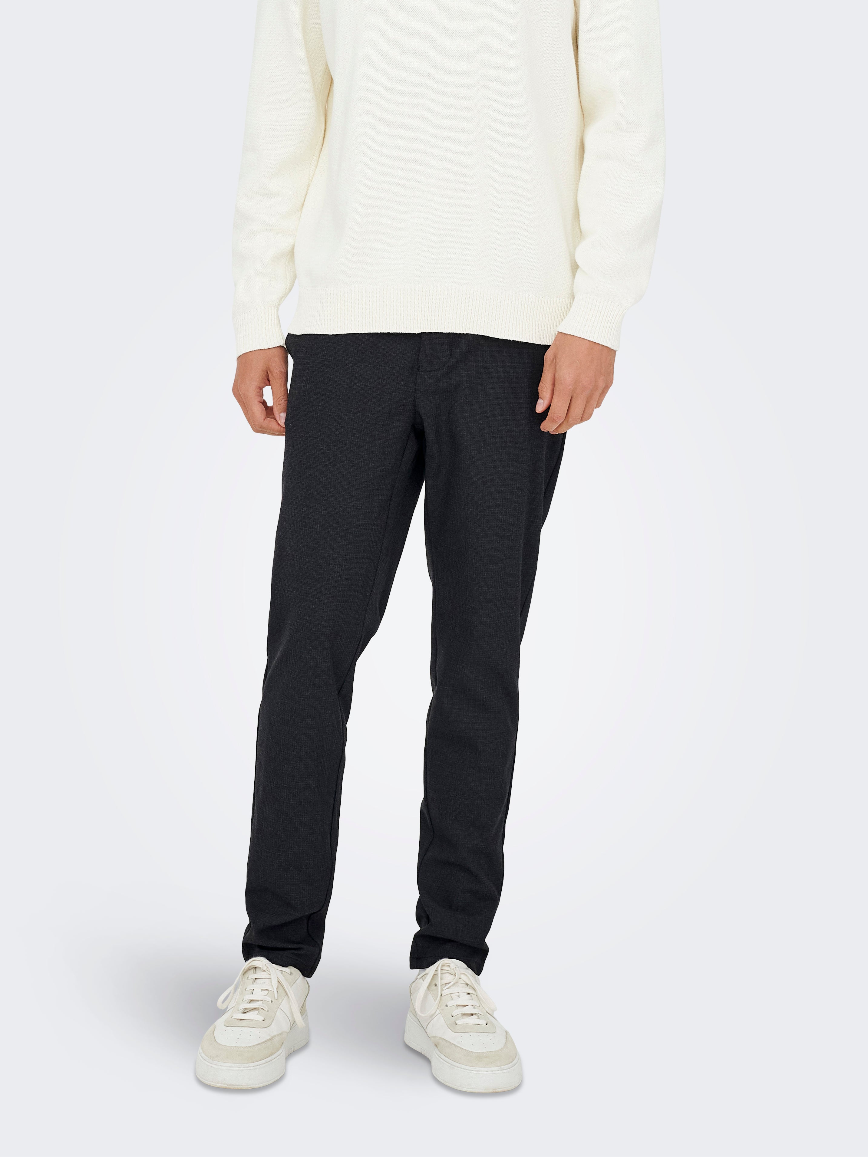 Kuna liibuva lõikega püksid istuvad nii hästi, on neid lihtne teiste riietega sobitada. Lihtsa kaasaegse looki loomiseks lisa lumivalge T-särk ja uued tennised. Täienda praktilise pealissärgi või kerge lendurijakiga, et luua enesekindel vabaaja look, mis ei pinguta üle, kuid on siiski pilkupüüdev. Kas soovid elegantset igapäeva riietust? Siis vali neutraalsed beežid või hallid kivisöekarva püksid ning peene kudum ja Chelsea saapad. Kui soovid põnevamat välimust, vali huvitava mustri või tekstuuriga kolmveerandpüksid, nagu musta-valge ruudulised, peenetriibulised või ruudulisest flanellist püksid. Selleks, et luua skandinaavia look, lisa T-särk, pane särk pükste sisse, ja täienda suure bleiseriga. ONLY & SONS usub, et suurepärase igapäeva looki loomiseks vajad selgeid nõuandeid.