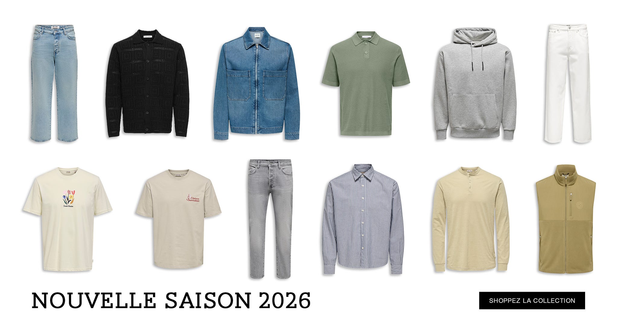 Que ce soit pour une soirée jeux vidéo avec vos potes ou pour votre prochaine réunion, vous aurez toujours l'air à la mode avec notre nouvelle gamme de vêtements. N'attendez pas ! Parcourez dès maintenant notre boutique en ligne et découvrez les vêtements ONLY & SONS parfaits pour toutes les occasions. Des Jeans, vestes, blazers et autres pièces mode vous attendent. Shoppez maintenant !